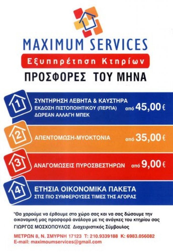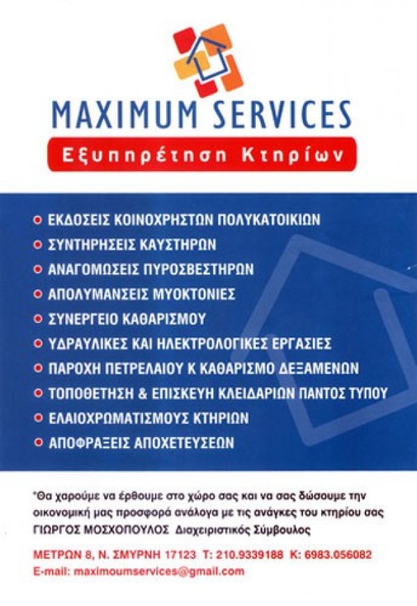 Η εταιρεία Maximum Services, με μακροχρόνια εμπειρία στον χώρο, παρέχει εκσυγχρονισμένες υπηρεσίες στην εξυπηρέτηση κτιρίων, σύμφωνα τις ανάγκες της κάθε πολυκατοικίας. Με άμεση ανταπόκριση (24 ώρες και αργίες), συνέπεια και άριστη γνώση των αναγκών διαχείρισης, λειτουργίας και συντήρησης πολυκατοικιών και μονοκατοικιών στο χαμηλότερο δυνατό κόστος.